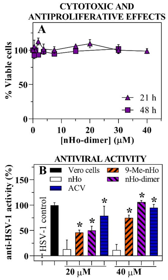 (A) Cytotoxic and antiproliferative effects of nHo-dimer (up to 40 µM) on Vero cells evaluated by MTS assay. Values are means ± SE of triplicates from three independent experiments. (B) Percentage of protection against HSV-1 of nHo-dimer (20 and 40 µM) obtained by the MTS assay. Results are means ± SE of triplicates of two independent experiments. (*) indicates significant statistical differences between the tested samples and the HSV-1 control (p < 0.05). ANOVA/Dunnett’s tests were carried out. For a comparative purpose, data corresponding to the treatment with ACV and data reported in the literature [] for two related compounds (nHo and 9-Me-nHo), obtained under the same experimental conditions, were also included. (C) Anti-HSV-1 activity at different concentrations, obtained by plaque reduction assays. Values represent the mean ± SE of two independent experiments in triplicate.