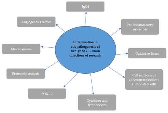 The following main research directions were observed: angiogenesis factors, IgG4, pro-inflammatory molecules, oxidative stress, cell surface, and adhesion molecules, tumor stem cells, cytokines and lymphocytes, SOX-10, proteomic analysis, and others (Figure 2). Most of the analyzed studies were retrospective, randomized, observational studies using healthy tissues or tissues obtained from patients with malignant tumors as control groups. The review also included several case series studies. Of the forty-six studies included in the literature review, eight investigated substance concentrations in plasma, two involved both plasma and tumor tissues, and the remaining studies focused on the expression of molecules in removed tumor tissues or the impact of these molecules on tumor development. The main method for determining markers among selected articles was immunohistochemistry. In some of the studies, molecular research also included the assessment of mRNA expression.