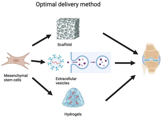 Optimal delivery methods for mesenchymal stromal cells (MSCs) in joint regeneration. The three main delivery methods are scaffold, extracellular vesicles, and hydrogels. Scaffolds are porous, supportive structures that enable MSCs to attach and proliferate, thereby maintaining cell viability and providing structural stability at the target site. Extracellular vesicles, which are cell-free particles derived from MSCs, contain signaling molecules (e.g., RNA, proteins) that facilitate tissue repair through intercellular communication, eliminating the need to introduce live cells. Hydrogels, gel-like materials that encapsulate MSCs, provide a hydrated environment that protects cells and enables their gradual release, supporting sustained therapeutic effects. These three delivery methods are directed toward the joint, representing their potential applications in regenerative treatments for conditions like osteoarthritis or cartilage damage. This figure highlights the adaptability of MSC-based therapies and the importance of selecting optimal delivery vehicles to enhance clinical outcomes.