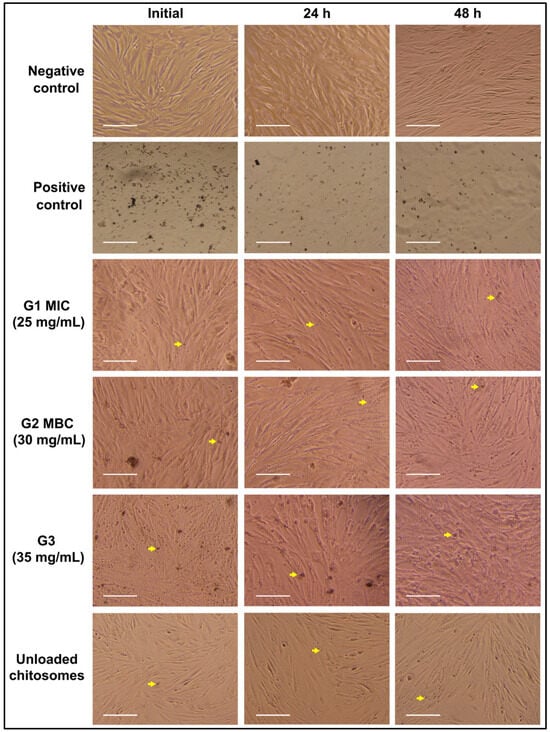 Microscopic images showing all experimental and control groups before treatment and 24 and 48 h post-treatment. All experimental groups demonstrated viable cells with minor morphological alterations. The nuclear wall and contents were observed to be intact. Unloaded chitosomes were evaluated to confirm their inertness and eliminate potential interference with the results. Yellow arrows indicate CM chitosomes.