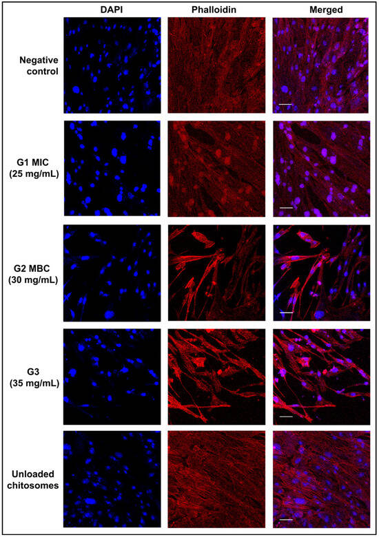 The hMSC-TERT cells were seeded in 4-well dishes at 5 × 104 cells/well and incubated with the various test concentrations of the CM nano-irrigant alongside the control groups for 1 h as previously described []. After 24 h of culture, the cells were washed twice with PBS (phosphate-buffered saline, Gibco™) and fixed with 4% paraformaldehyde in PBS (Sigma-Aldrich, St. Louis, MO, USA) for 20 min at 4 °C; the cell membrane was permeabilized for 15 min with 0.1% Triton X-100 (Sigma-Aldrich), and the cells were then treated with a blocking solution (10% bovine serum albumin (BSA) in PBS) for 1 h to block nonspecific binding sites. Thereafter, Alexa Fluor™ 594 Phalloidin (1:800, Invitrogen™ Molecular Probes, Eugene, OR, USA) was used to stain actin filaments for 20 min at room temperature, and 1 µM 4′,6-diamidino-2-phenylindole dihydrochloride (DAPI, Invitrogen™ Molecular Probes) was used to counterstain the nuclei for 10 min. All the samples were rinsed and stored in PBS before images were acquired with a Nikon C2 confocal laser scanning microscope (Nikon Instruments Inc., Tokyo, Japan) operated in the MCB Laboratory.