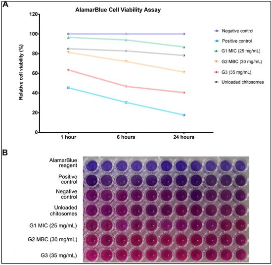 In this study, a group of unloaded chitosomes was investigated to confirm its inertness (Figure 1, Figure 2, Figure 3, Figure 4, Figure 5 and Figure 6). Although the proliferative rates were somewhat slower (Figure 4), the final result is relatively similar to the proliferative score of the negative control group (untreated cells with media). This aligns with previous reports in the literature that prove chitosan had no or minimal negative effect on cellular viability and proliferation [,]. Due to the original sources of both liposomes and chitosan, biocompatible results are not surprising [,,,].