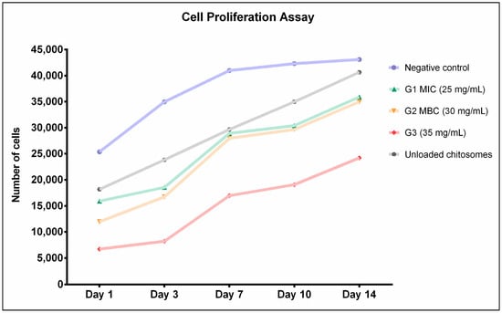 Cellular proliferation assays showed steady proliferation rates in all experimental groups, with Group 3 having the lowest cell count. Unloaded chitosomes resulted in a comparable proliferation rate to the negative control group (cells with no treatment). Data were generated from 2 independent experiments with 11 replicates (n = 22).