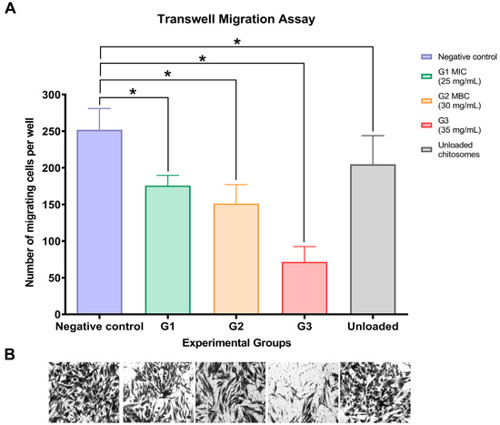 (A) Transwell migration assay values for experimental and control groups. All groups, including unloaded chitosomes, showed statistically significant differences compared to the negative control. (* statistical significance at p < 0.05). (B) Values represent the mean of migrating cells per well ± SD (standard deviation) of 3 independent experiments performed in triplicates (n = 9).