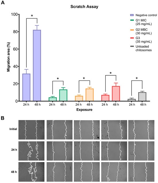 Results of the scratch migration assay at 0, 24, and 48 h. The wound closure percentage is shown in (A), and representative images are shown in (B). All groups showed significant differences post-intervention compared to initial exposure (* statistical significance at p < 0.05). All data were presented as mean migration area percentage ± SD of at least 4 independent experiments with triplicates (n = 12).