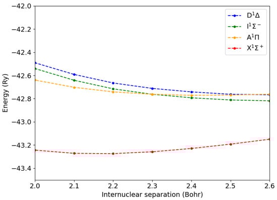 In Figure 1, we display the total energy of the CO molecule in its ground state () and in the lowest singlet states (, , ). While the states were not degenerate, all the others were doubly degenerate.