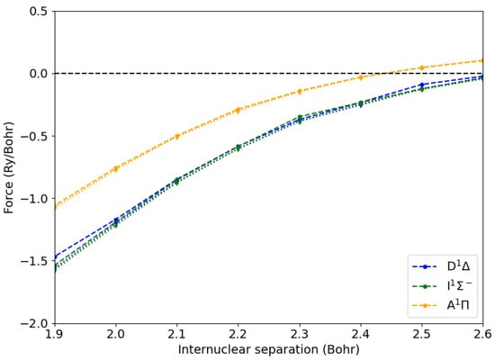 Atomic forces from Hellmann–Feynman (disks, dashed lines) and numerical differentiation (diamonds, dotted lines) methods for the carbon atom of a CO molecule in the ground state () and in the lowest excited states as a function of the C-O internuclear distance.