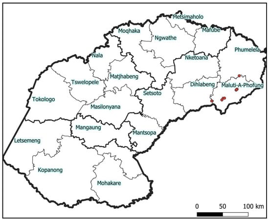 Study area in the Maluti-A-Phufong and Phumelela municipalities (Free State province of South Africa). Red circles represent sampling locations.