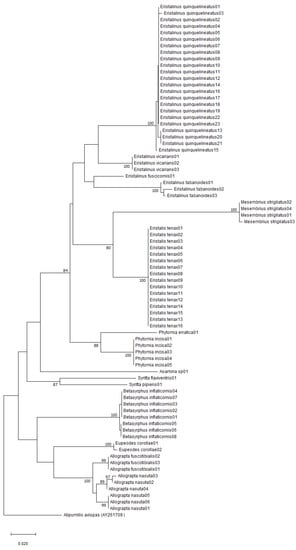 - Mengual, X.; Ståhls, G.; Rojo, S. Molecular phylogeny of Allograpta (Diptera, Syrphidae) reveals diversity of lineages and non-monophyly of phytophagous taxa. Mol. Phylogenetics Evol. 2008, 49, 715–727. [Google Scholar] [CrossRef]