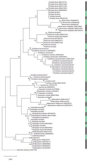 The neighbour-joining (NJ) analysis of the COI sequences revealed that all species formed distinct clusters in the tree (Figure 2). All nine species represented by more than two haplotypes formed clusters with 100% bootstrap values, except A. nasuta where the combined bootstrap value of the clusters was 95% (Figure 2). However, a Genbank sequence putatively identified as Allograpta fuscotibialis (Accession number: MT449479) grouped closely with sequences of Allograpta nasuta identified with the help of the published work of Jordaens et al. []. The distances between the two taxa ranged from 2.86 to 3.08%, and the grouping of that putative A. fuscotibialis sequence with the rest of the known A. nasuta sequences was supported by a bootstrap value of 96 (Figure 3).