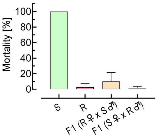 Genetics of ketoenol resistance in Aleyrodes proletella. Efficacy of a discriminating dose of 200 mg L−1 spiromesifen against 2nd-instar nymphs (F1) resulting from reciprocal crosses of A. proletella adults of strains 6/19 (S, susceptible) and SPI-5/19 (R, selected resistant). Data are mean values ± SD (n = 4).