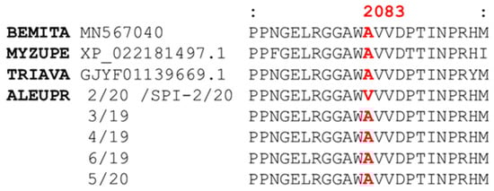 Alignment of partial acetyl-CoA carboxylase (ACC) sequences. The amino acid alignment shows the conserved region of the carboxyltransferase (CT) domain harboring the A2083V (Bemisia tabaci (BEMITA) ACC numbering) target-site mutation detected in field populations of Aleyrodes proletella such as strain 2/20 highly resistant to ketoenol insecticides. Strain SPI-2/20 originates from strain 2/20, but continuously maintained under selection pressure with 200 mg L−1 spiromesifen. Abbreviations: MYZUPE, Myzus persicae; TRIAVA, Trialeurodes vaporariorum; ALEUPR, Aleyrodes proletella. GenBank accession numbers: 2/20 (GJYF01020973.1), 3/19 (GJYF01046828.1), 4/19 (GJYF01092380.1), 6/19 (GJYF01137039.1) and 5/20 (GJYF01105771.1). A full-length ACC alignment is given in Figure S3.