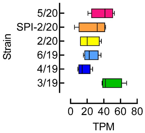 Abundance of acetyl-CoA carboxylase (ACC) transcripts in adults of different strains of Aleyrodes proletella. Box and whiskers plot (min to max) of ACC transcripts per million (TPM) expression values scaled to a common median of 10. Data are based on RNAseq analysis of individual adults (n = 4) from different strains.