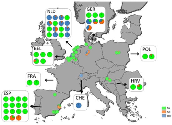 Mapping of ketoenol resistance in different European countries. Genotyping of ACC A2083V ketoenol target-site resistance alleles in adults of Aleyrodes proletella populations collected from eight European countries between 2019 and 2021. Pie charts display the proportion of RR resistant homozygote (blue), SR heterozygote (orange), and SS susceptible homozygote (green) genotypes. Country codes: BEL, Belgium; CHE, Switzerland; ESP, Spain; FRA, France; GER, Germany; HRV, Croatia; NLD, Netherlands; POL, Poland.