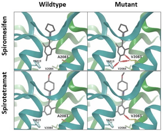 Computational modelling. Molecular docking of spiromesifen and spirotetramat into the catalytic pocket of the acetyl-CoA carboxylase (ACC) carboxyltransferase (CT) domain suggests implications for binding in the mutant form (V2083) when compared to the wild-type form (A2083). Potential clashes between ketoenols and amino acid residues interfering with high-affinity binding in the mutant variant are depicted by red arrows. The homology models are based GenBank entry 3PGQ.