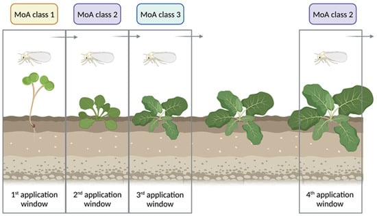 Mode of action (MoA) treatment windows approach for resistance management. Insecticide treatment windows based on different MoA classes aim to manage whitefly populations using the minimum duration of a single generation (e.g., 20–30 days). Multiple applications of the same MoA are possible within a treatment window. When a treatment window is completed, a different MoA class is used in the next treatment window, and, if possible, a different MoA should be applied in a third MoA treatment window. The example shown is based on a situation with three different MoA classes available that work equally well against Aleyrodes proletella. (Created with BioRender.com, accessed on 30 October 2022).