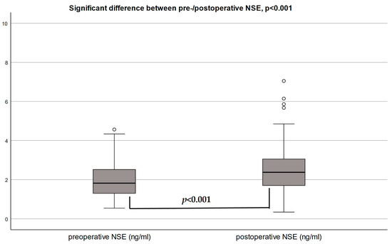 Preoperative median NSE level amounted to 1.94 ng/mL (1.33–2.65) in the group with impaired WL learning (82/146) versus 1.75 ng/mL (1.25–2.35) in the group with preserved function (64/146). This difference was not significant, p = 0.61. Also, for WL recall, preoperative median NSE levels of 1.83 ng/mL (1.24–2.61) and 1.90 ng/mL (1.4–2.37) for the groups of impaired (109/145) and unimpaired patients (36/145), respectively, did not differ (p = 0.36).