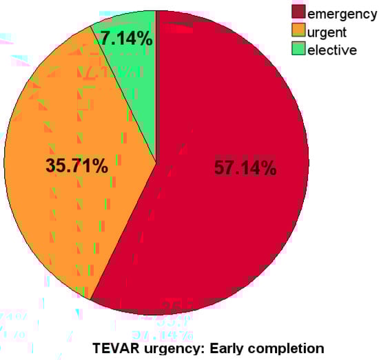 Pathologies of the aortic arch and the descending aorta are a complex challenge for any surgeon [1,2,3]. For years, the elephant trunk technique was the method of choice in a multistage approach, followed by an additional open replacement of the thoracic or thoracoabdominal aorta [1]. With the development of stent-graft protheses, the frozen elephant trunk (FET) was introduced as a possible single-step procedure for treating aortic arch diseases without the need for further interventions [4,5,6,7]. However, up to a third of the patients treated with FET still need additional surgery to achieve sufficient aortic remodeling [8,9,10]. Open surgical repair of the downstream aorta following FET was previously the standard procedure [11]. However, with the advent of thoracic endovascular aortic repair (TEVAR), which has been shown to result in reduced mortality and morbidity, this approach has become increasingly obsolete [12,13]. This retrospective analysis aimed to evaluate the impact of an early versus a late endovascular completion with TEVAR in patients treated with FET.