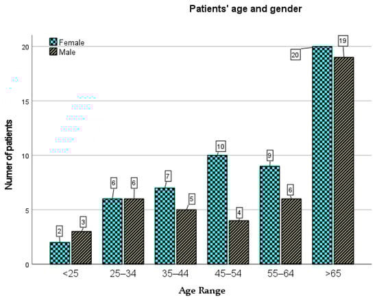 The respondents were divided into six age groups (Figure 1): aged up to 25 (5 people, i.e., 5.1%), 25 to 34 years of age (12 people, i.e., 12.1%), 35 to 44 years of age (13 people, i.e., 13.1%), 45 to 54 years of age (14 people, i.e., 14.1%), 55 to 64 years of age (15 people, i.e., 15.2%) and aged above 65 (39 people, i.e., 39.4%). One person did not disclose his or her age (i.e., 1%). Eventually, this record was deleted due to many missing data.