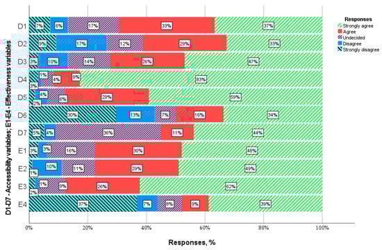 The analysis was conducted using the SPSS v. 27 statistical package (Predictive Solution, Krakow, Poland) and Microsoft Excel 365 (Microsoft, Redmond, WA, USA). Prior to the questionnaires’ statistical analysis, a database of responses was created. Data from the paper-based questionnaires were transferred to a spreadsheet. In the survey, the questions were not deliberately divided into dimensions. The next step was to sort the statements according to the dimensions: accessibility, coordination, comprehensiveness, effectiveness, continuity, communication and experience with the system; the analysis for the purpose of this study covered only two dimensions: accessibility and effectiveness.