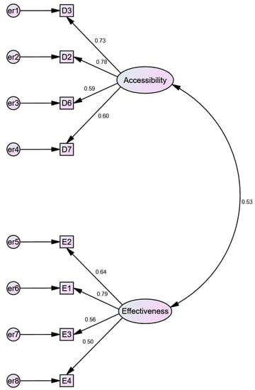 PCA retained two factors with eigenvalues greater than 1. The total variance explained by the EFA model was equal to 56% (Table 6), which should be greater than 50% []. For eight variables, the factor loadings ranged from 0.638 to 0.837 and are greater than the recommended 0.35 cut-off point []. A reliability analysis showed that the extracted model was acceptable since the Cronbach’s alpha coefficients for accessibility (0.666) and effectiveness (0.663) were greater than 0.6 []. Those values (Table 6) allowed for further factor analysis [,].