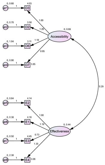 The CFA confirmed the EFA model with eight variables. Standardised and non-standardised solutions are presented respectively in Figure 3 and Figure 4. A convergent validity—the strength of relationships of the model’s factor variables is not supported by the average variance extracted (AVE), which has to be greater than 0.5. The AVE for accessibility equals 0.461 and AVE for effectiveness equals 0,401. This confirmed the low values of the Cronbach’s alpha coefficients calculated during the EFA. Nevertheless, the convergent validity might be confirmed using the composite reliability (CR) index, which should be higher than 0.7. CR values for accessibility and effectiveness equal 0.771 and 0.722, respectively, which means that the convergent validity of the model is confirmed.
