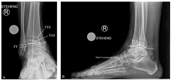 Further, in the ap view, the tibiotalar surface angle (TTS; normal range; 87.2 ± 2.8 degrees) is measured [13,14]. The TTS in varus ankle OA is <84.4°.