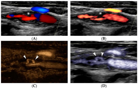 - Rafailidis, V.; Chryssogonidis, I.; Xerras, C.; Nikolaou, I.; Tegos, T.; Kouskouras, K.; Rafailidis, D.; Charitanti-Kouridou, A. A comparative study of color Doppler imaging and contrast-enhanced ultrasound for the detection of ulceration in patients with carotid atherosclerotic disease. Eur. Radiol. 2019, 29, 2137–2145. [Google Scholar] [CrossRef]