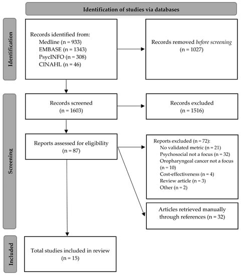 A systematic literature search of PubMed, Embase, PsycINFO, and CINAHL was conducted of all articles published between 1946 and August 2022. Search terms included a combination of appropriate database MeSH terms, subject headings, and keywords for the concepts of oropharyngeal cancer, QOL, patient-reported outcome measures, and different emotional and mental states (Supplementary S1). The search strategy was developed with the assistance of a medical librarian guided by the Joanna Briggs Institute; inclusion and exclusion criteria were determined by population type, concept, and context framework (Table 1) [].