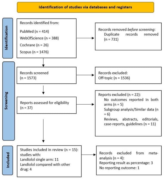 A total of 2304 articles were initially retrieved. Ultimately, 15 studies satisfied the predefined eligibility criteria for the systematic review and 11 studies were included in the meta-analysis. In four studies, landiolol was compared to other antiarrhythmic therapy (in two studies with digoxin and in two studies with diltiazem), while seven studies were single-arm. The detailed flow diagram of the study selection process is presented in Figure 1.