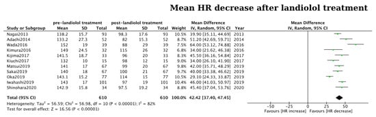 For the continuous outcomes of interest (pre- and post-treatment blood pressure, HR and LVEF values), a random effects meta-analysis was performed to pool their mean difference pre- and post-landiolol administration. Forest plots were constructed to show the overall effect of landiolol administration in each parameter.