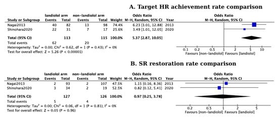 (A) Forest plot of comparison in target HR achievement rates between landiolol and non-landiolol treated groups Blue squares represent the mean Odds ratio for target HR achievement of each study and the black diamond represents the overall pooled Odds ratio for target HR achievement from all the included studies [,]; (B) Forest plot of comparison in sinus rhythm restoring rates between landiolol and non-landiolol treated groups. Blue squares represent the mean Odds ratio for SR restoration of each study and the black diamond represents the overall pooled Odds ratio for SR restoration from the included studies [,].