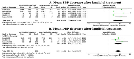 (A) Forest plot of the systolic blood pressure reduction after landiolol treatment. Green squares represent the mean SBP decrease of each study. The black diamond represents the overall mean SBP decrease from the included studies [,,,,]; (B) Forest plot of the diastolic blood pressure reduction after landiolol treatment. Green squares represent the mean DBP decrease of each study. The black diamond represents the overall mean DBP decrease from the included studies [,,].