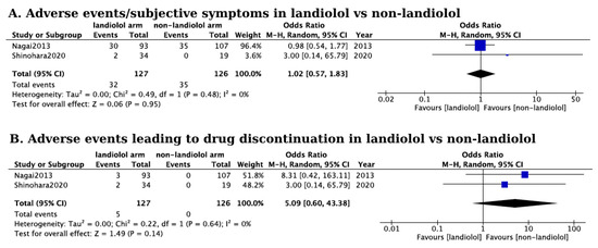 (A) Forest plot of comparison in the rates of adverse events or subjective symptoms report in landiolol and non-landiolol treated groups. The blue squares represent the Odds ratio of adverse events/subjective symptoms from each study. The black diamond represents the overall pooled Odds ratio of adverse events/subjective symptoms from the included studies [,]; (B) Forest plot of comparison in the rates of adverse events leading to drug discontinuation in landiolol and non-landiolol treated groups. The blue squares represent the Odds ratio of adverse events leading to drug discontinuation of each study. The black diamond represents the overall pooled Odds ratio of adverse events leading to drug discontinuation from all included studies [,].