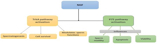 The significant role that NGF plays in the male reproductive system results from its interaction with its receptors, TrKA and p75. In animal models, NGF-induced TrkA receptor stimulation triggers the activation of pathways such as the Ras/MAPK, PI3K/Akt-mTOR, and phospholipase C (PLC) pathways. This action promotes cell survival and modulates sperm functions like survival, cell proliferation, and the acrosome reaction [,,]. Mice that are missing NGF [] or TrkA genes [,] do not survive after their birth.