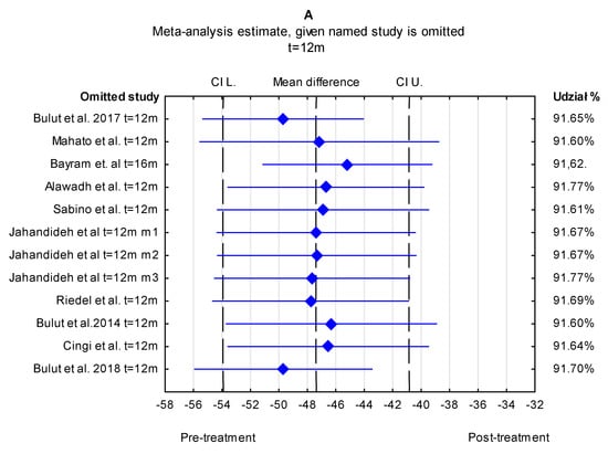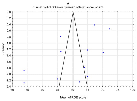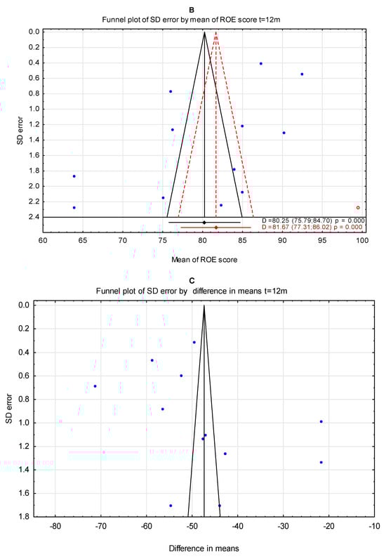 The trim-and-fill method was used to estimate the effect of potentially missing studies due to publication bias in the funnel plot for mean post-treatment ROE score and mean difference pre-treatment vs. post-treatment ROE score after t = 12 m. In the case of mean post-treatment ROE score, the received value was 81.67 (95% confidence interval from 77.31 to 86.02), and for pre-treatment vs. post-treatment the value was −39.20 (95% confidence interval from −48.13 to −30.26) (Figure 12).