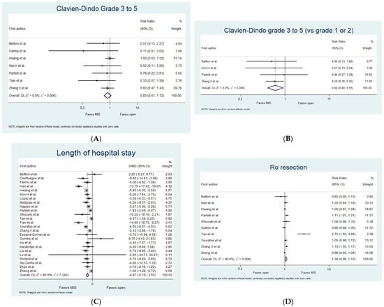 There was no significant difference in the risk of severe complications, defined as Clavien–Dindo grades 3 to 5 (versus grades 0 to 2), between the MIS and the OS groups (RR 0.83, 95% CI (0.61 to 1.12), I2 = 0%, N = 1950, 7 studies, MIS vs. OS; Figure 2A) [15,17,19,20,25,29,32]. However, among the subset of patients who experienced any complications reported according to Clavien–Dindo classification (using the definition rate of a Clavien–Dindo grade of 1 or higher), the risk of those complications being severe (Clavien–Dindo grades 3 to 5 vs. grades 1 to 2) was significantly lower in patients who underwent MIS (RR 0.60, 95% CI (0.40 to 0.91), I2 = 0%, N = 334, 4 studies, MIS vs. OS; Figure 2B) [15,20,25,32].