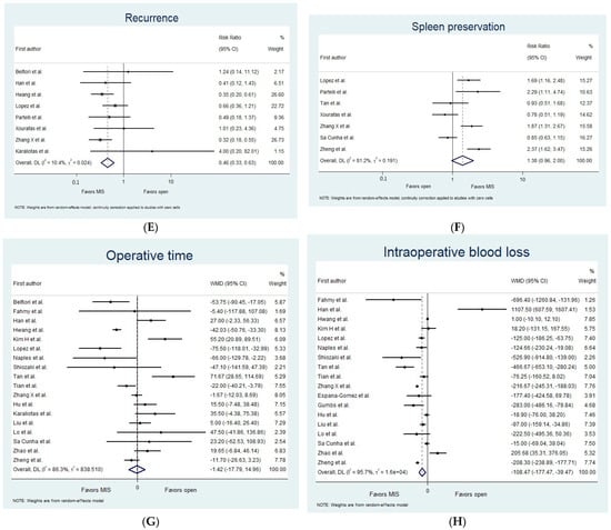 A significantly lower risk of tumor recurrence was observed in the MIS group (RR 0.46, 95% CI (0.33 to 0.63), I2 = 10.4%, N = 1646, 8 studies, MIS vs. OS; Figure 2E) [15,18,19,22,25,30,32,36].