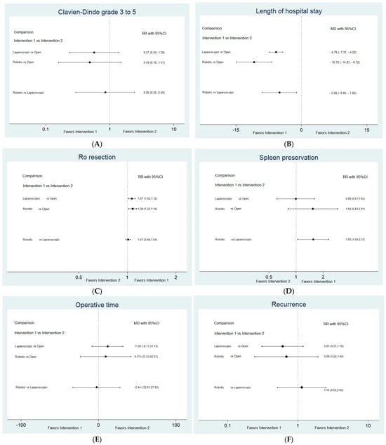 Interval plots from the network meta-analysis are shown in Figure 3. We accepted the consistency hypothesis for all outcomes except for the operative time and spleen preservation rates, for which the p-value of the global test for inconsistency was less than 0.05. The structures of the connected networks for all the investigated outcomes are shown in Supplementary Figure S5. Forest plots are shown in Supplementary Figure S6.