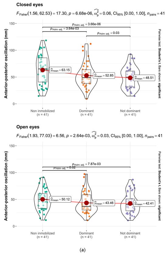 Further analysis using an interaction model to assess the effects of eye condition (open vs. closed) separately revealed that immobilization impacts APO irrespective of eye condition (p < 0.001), without significant differences between immobilization of the dominant or non-dominant limb (Figure 2a).