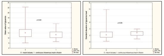 Glycemic variability indicators are presented in Figure 3. There was a tendency towards a lower value of average glycemia on the first day (Figure 3, p = 0.064). At the same time, the standard deviation of glucose fluctuations was slightly higher in the CIT group (p = 0.056). The maximum values of glucose levels on the first day did not differ between the groups, but the minimum values were lower in the CIT group (p < 0.001). At the same time, the range between the maximum and minimum glucose values was also lower in the CIT group (Figure 3, p < 0.001).
