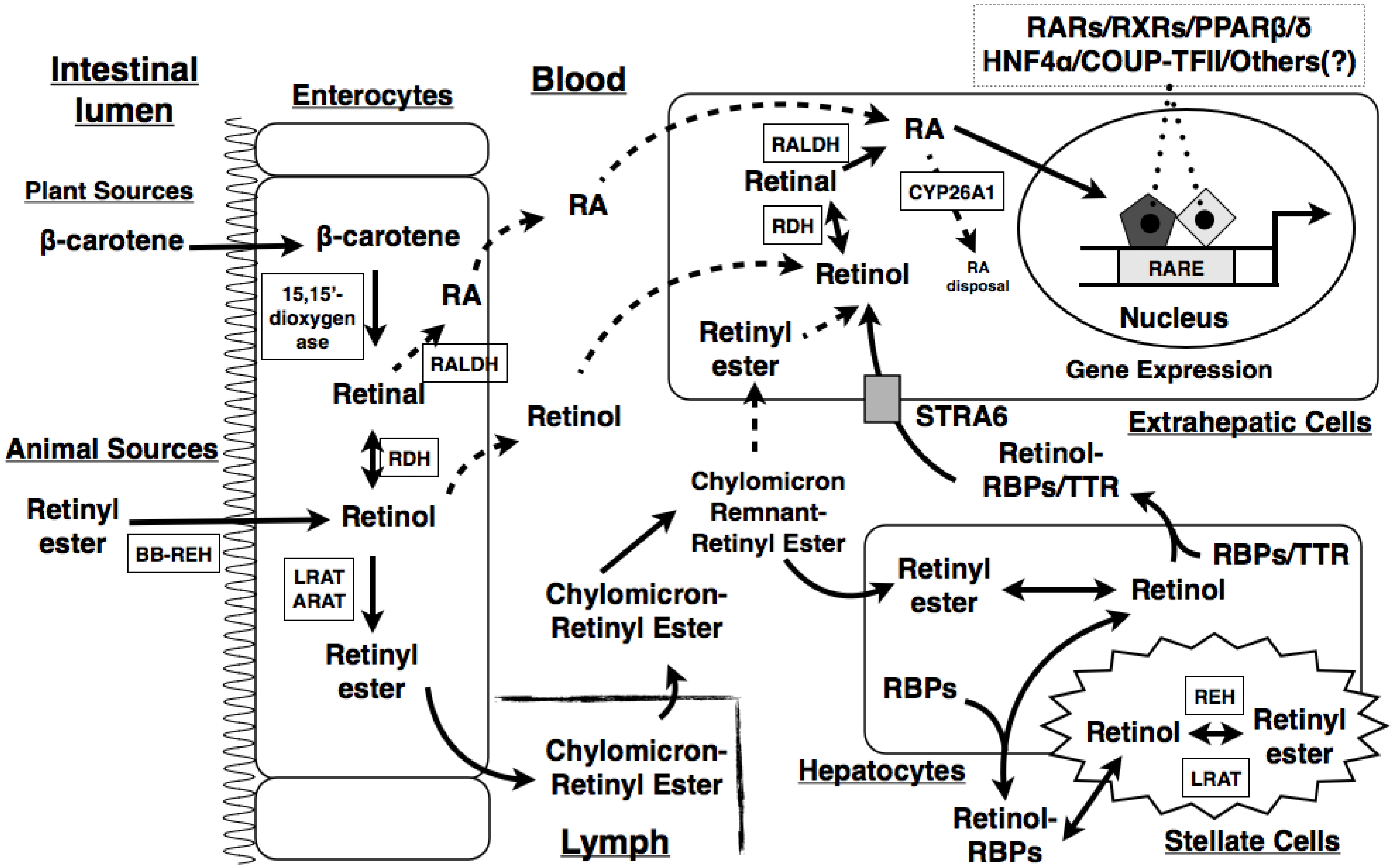 Schematic representation of vitamin A (VA) digestion, absorption, transport, and metabolism in the body. Dietary VA from plant and animal sources is digested in the intestinal lumen and absorbed by enterocytes via different mechanisms. Within the enterocytes, the dietary VA is converted into retinyl esters, which are packaged into chylomicrons for the secretion into the lymph and eventually enter the circulation. The lipoprotein lipase hydrolyzes triglycerides (TGs) on the chylomicrons to produce chylomicron remnants. The retinyl ester-containing chylomicron remnants are eventually taken up by hepatocytes, where the retinyl esters are again hydrolyzed into retinol. The released retinol can be transported to target cells and catabolized into retinal, retinoic acid (RA), or other metabolites. Excessive retinol is re-esterified into retinyl esters, which are stored in stellate cells. BB-REH, brush-border retinyl ester hydrolase; LRAT, lecithin:retinol acyltransferase; ARAT, acyl-CoA:retinol acyltransferase; RBP, retinol binding protein; RDH, retinol dehydrogenase; RALDH, retinal dehydrogenase; REH, retinol ester hydrolase; STRA6, stimulated by retinoic acid 6; RA, retinoic acid; RARE, retinoic acid responsive element; RAR, retinoic acid receptor; RXR, retinoid X receptor; TTR, transthyretin; PPAR, peroxisome proliferator-activated receptor; HNF4α, hepatocyte nuclear factor 4α; COUP-TFII, chicken ovalbumin up-stream transcription factor II.