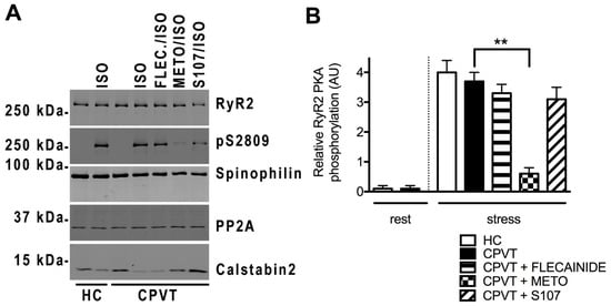 SR Ca2+ leak through RyR2 has been associated with post-translational modifications of the RyR2 macromolecular complex including PKA-phosphorylation and Calstabin2 depletion []. We explored the RyR2 macromolecular complex by co-immunoprecipitation in HC and CPVT cell lysates under resting and stress conditions. We evaluated the amount of Calstabin2 bound to RyR2 and the level of RyR2 PKA phosphorylation at its specific site S2809 and incubated with flecainide (FLEC), metoprolol (METO) and S107. We also explored some of the key proteins responsible for reversing the phosphorylation modifications such as type 2 protein phosphatase (PP2A) and spinophilin (PP1 anchoring protein).