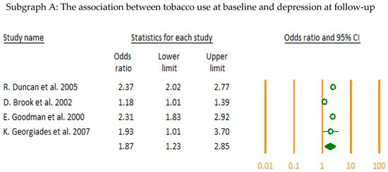 - Duncan, B.; Rees, D.I. Effect of smoking on depressive symptomatology: A re-examination of data from the National Longitudinal Study of Adolescent Health. Am. J. Epidemiol. 2005, 162, 461–470. [Google Scholar] [CrossRef] [PubMed]