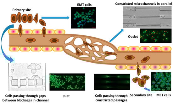 In most previous studies, the morphology and characteristics of cells undergoing EMT and MET have been studied under static conditions [,]. Hence, the physiological conditions in which the EMT cells traverse through the blood vessels or microcapillaries and undergo reverse transition at the secondary site are a very important area of investigation. An attempt to find the percentage viability and metastatic potency of the EMT cells after transiting through microcapillaries would reveal important information that could address many of the questions related to the complex phenomenon of cancer metastasis. Moreover, a detailed investigation of the treatment of cancer cells with drugs at different stages of their flow from the primary site to a secondary site undergoing EMT to MET transitions (through the capillaries) would be crucial for designing future theranostic devices aiming at curative or palliative treatment. Hence the dynamics of the motion, deformation, and behavioral changes of EMT cancer cells passing through microcapillaries still seem to be underexplored and require further attention.