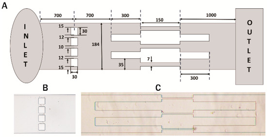 Design of the microchannel. (A) Schematic representation of the microchannel (not to scale); (B) magnified view of the 30 μm blockages; (C) magnified view of the series of constricted channels. All dimensions in μm.