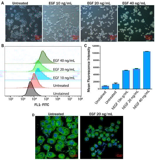 Nearly confluent MDA-MB-468 cells were washed with phosphate-buffered saline (PBS), trypsinized, and counted in a Countess cell counter (Thermo Fisher Scientific). Cells were seeded in a six-well plate at a density of 2 × 105 cells per well in 2 mL of medium (10% FBS). The six-well plates were incubated in a CO2 incubator for 24 h for complete attachment of the MDA-MB-468 cells. After 24 h, the medium in each well was replaced with a serum-free medium and the cells were again incubated for 12 h. Subsequently, the cells were treated with EGF at 10, 20, and 40 ng/mL in a serum-free medium. The morphology of the untreated and EGF-treated cells was monitored and images were captured in a microscope (Nikon Eclipse Ti-U). These EGF treated cells (MDA-MB-468 cells) are henceforth referred to as EMT cells.