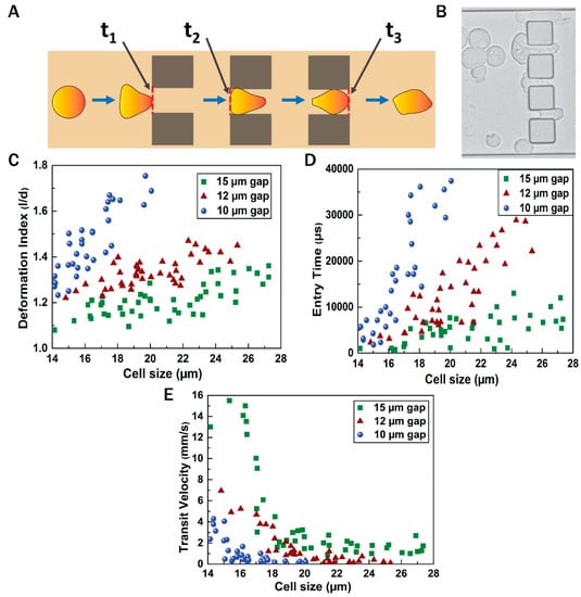 Flow dynamics of cells through blockages. (A) Stepwise motion of the cell through a blockage; (B) microscopic view of invasion of cells through the gaps between blockages (C–E) deformation index, entry time, and transit velocity of the cells through the gaps of varying sizes between blockages, respectively.