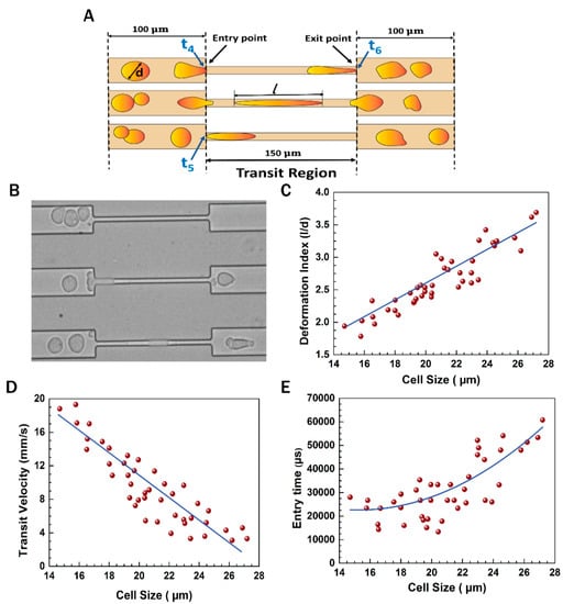 As mentioned earlier (Figure 2), each of the three constricted passages were of equal length (150 μm) and width (7 μm). Figure 5 shows the flow dynamics of the cells through the constricted 7 μm microchannels. Time instants t4, t5, and t6 were observed when a cell passed through any of the constricted paths. As shown in Figure 5A, t4 is the time instant when the cell front touched the entry point in any channel, t5 is the time instant when the entire cell has just entered the constricted passage and its rear touched the entry point, and t6 is the time instant when the deformed cell’s front touched the exit point. The entry time was calculated by subtracting t4 from t5. The ratio of the maximum elongation length (l) to the undeformed cell diameter (d) was calculated as the deformation index. The average transit velocity was obtained by dividing the distance travelled (150 μm) by the time taken (t6–t4). A microscopic view of the cells flowing through the constricted channels is shown in Figure 5B. Figure 5C shows the deformation index of the cells through the constricted 150 μm long passage. The cell sizes varied in the range of 14–28 μm. It was observed that the large cells underwent enhanced elongation compared with small cells. The transit velocity and entry time of the cells are shown in Figure 5D,E, respectively. It is noted that large cells took more time to accommodate themselves inside the constricted passage, exhibiting an enhanced entry time and a lower transit velocity.