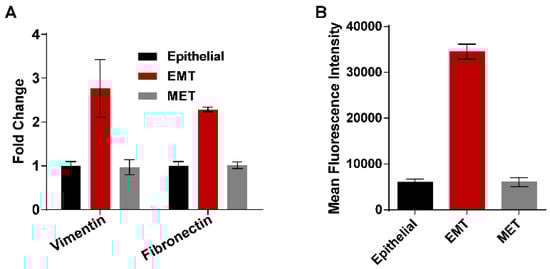 Gene expression studies by real-time PCR and flow cytometry. (A) Comparison of expression of vimentin and fibronectin genes in epithelial, EMT, and mesenchymal to epithelial transition (MET) cells; (B) vimentin expression studied at the protein level using anti-vimentin antibody in flow cytometry.